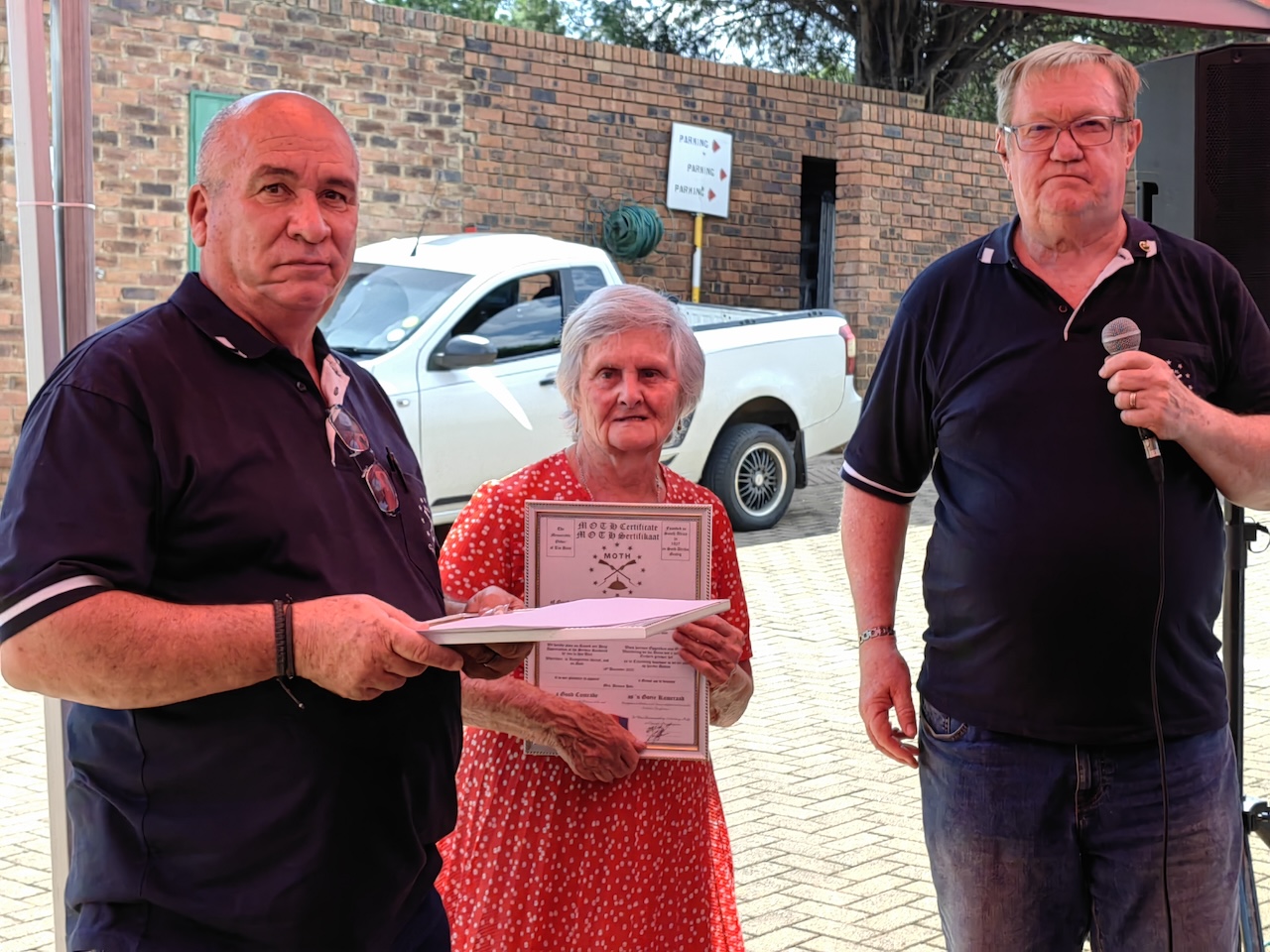 At the Cottesloe Homes residents luncheon, Richard Wilson, The Chairman, presented a Certificate of Good Comradeship to Susanna van Schalkwyk, This is an award given to a non Moth who has gone out of their way to assist the Moth. In Susanna’s case she goes out of her way to assist Moth Cottesloe Homes.