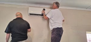 Moth Gary Finlay cleaning the airconditioner while Moth Jaco gives instructions