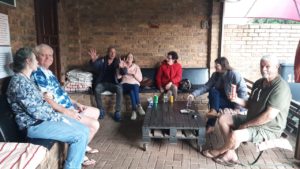 Moth Shane Daniell giving the finger with S-Suptr Evelyn vd Merwe, Moth Eddie Schnettler, Esmé Benade, Liz Berry, Susan Finlay with Moth Rodney Driver listening attentively